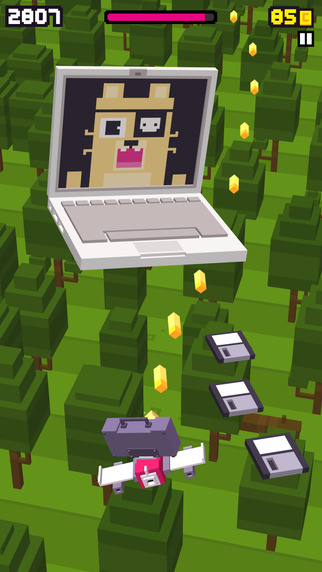 游戏里你要扮演一只蠢萌的动物,不过这次旅程不再发生在地面,而是在天上,你的敌人也不再是那些横冲直撞的汽车,而是携带着"致命武器"的日常用品。比如,一台街机会向你俯冲而来,并会向你发射"手柄波";一段正在Viewtube平台直播猫咪动态的视频,朝你扔"播放"、"暂停"、"关闭"等视频网站常用的按钮;那台自动售卖机也发疯了,拼命向你吐可乐;还有弹磁带的老式录音机......这些弹幕子弹看起来都没有什么杀伤性,都是些糖衣炮弹。